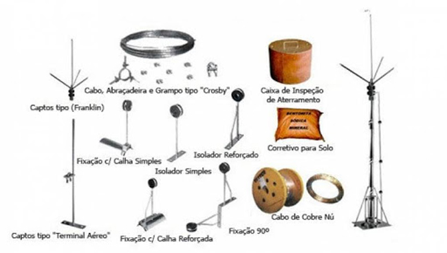 Entre os tipos mais comuns, está o sistema Gaiola de Faraday, composto de seis partes principais: captor do tipo Terminal aéreo, cabo de cobre, suportes isoladores, tubo de proteção, malha de aterramento e conector de medição. Outro tipo é o Franklin onde os principais componentes são Captador tipo Franklin ( em forma tridente), poste metálico, cabo de cobre, caixa de inspeção, haste copperweld e conector cabo/haste. Existe ainda outros tipos de sistemas, mais complexos, para sistema de maior risco.